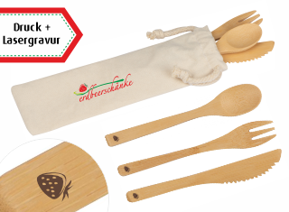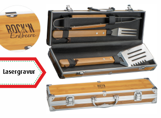3-teilig, bestehend aus Grillzange, Fleischgabel und Wender in einem verschließbaren Koffer mit Bambusapplikationen und Lasergravur.
