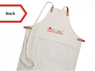 Bedruckte Kochschürze aus Baumwolle mit zwei Fronttaschen und verstellbaren Gurten aus farblich abgesetzten Akzenten.